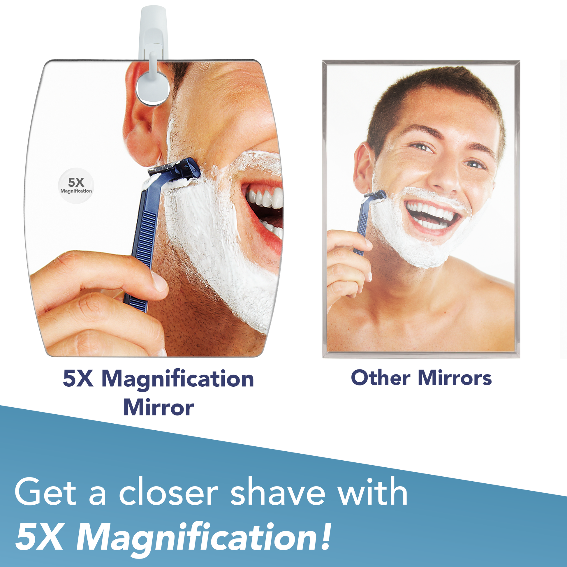 - MAGNIFYING: Never miss a spot shaving again when you can see your reflection 5X closer. The 6.75" x 5.75" magnifying mirror gives you an up close look for a clean shave without distorting your reflection.